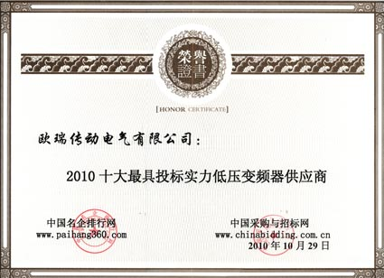 歐瑞傳動(dòng)獲“2010十大最具投標(biāo)實(shí)力低壓變頻器供應(yīng)商”稱號(hào)