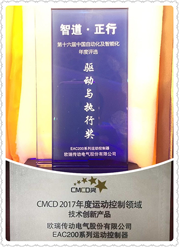 因其優秀的運動控制功能及良好的用戶使用體驗,2018年1月,在中國傳動網、中國運動控制產業聯盟舉辦的“智能時代創新制造--2018智能制造&中國運動控制行業發展高峰論壇”上,EAC200系列運動控制器獲得了“CMCD2017年度運動控制領域技術創新產品獎”。