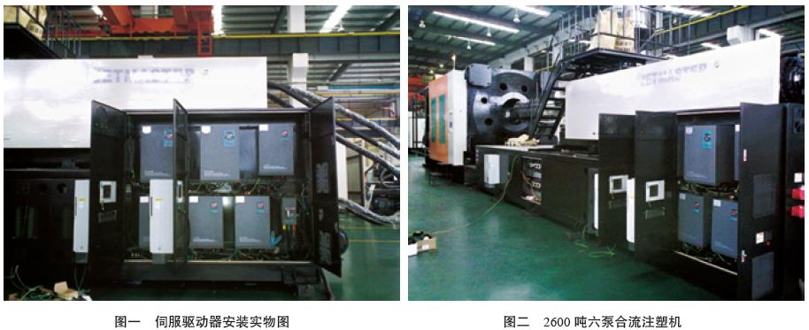 圖二是2600 噸注塑機的整機照片。圖片從左到右依次為注塑機的搖臂機械結構、模具夾板、炮筒、加料桶和扶梯、注塑機主體配電柜和伺服驅動器,伺服電機則在注塑機主體配電柜的后面。