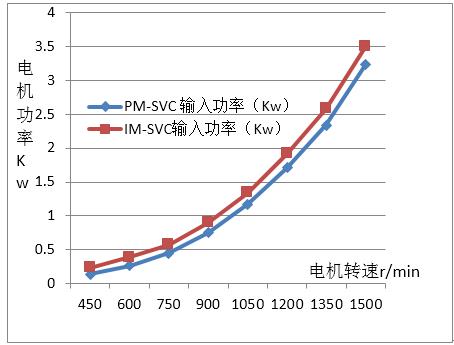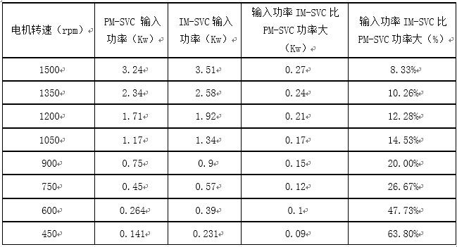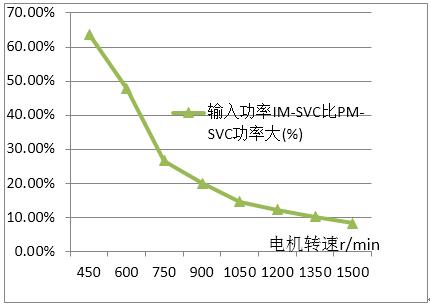 相同的風(fēng)機(jī)負(fù)載下,用同一臺(tái)變頻器帶載同功率的同步機(jī)和異步機(jī),分別對(duì)應(yīng)用PM-SVC控制和IM-SVC控制,在相同的風(fēng)機(jī)轉(zhuǎn)速下同步機(jī)電流更小,耗電更少。